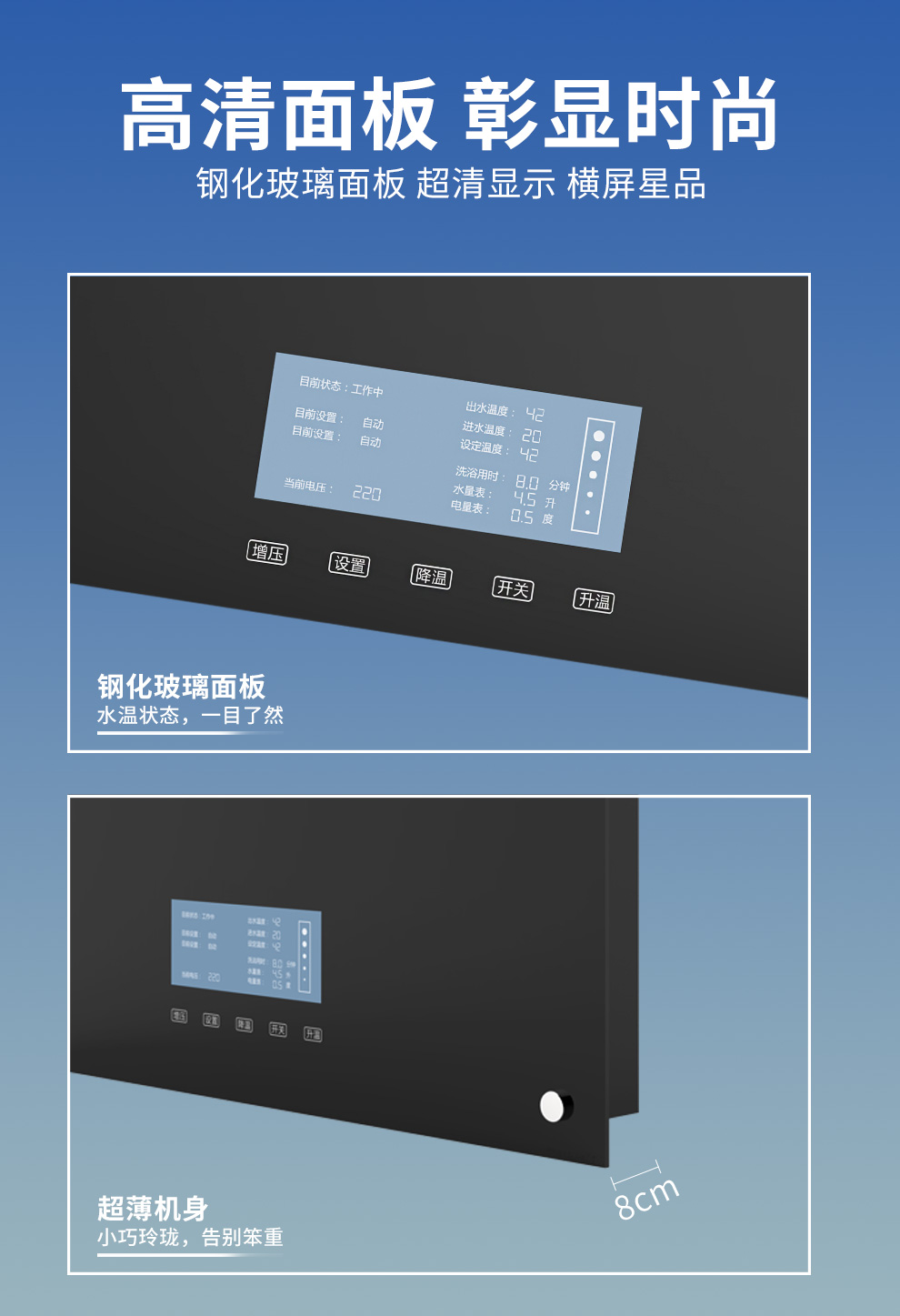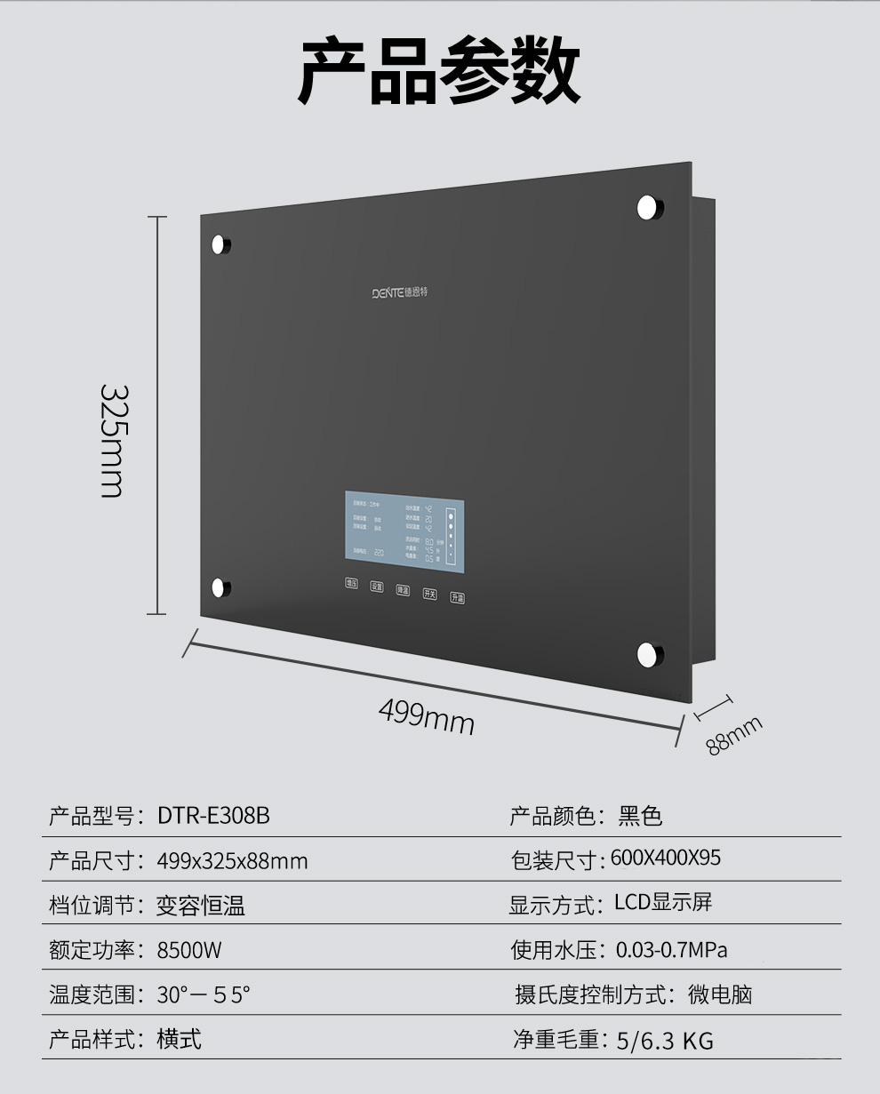 產品中心 > 即熱電熱水器系列> 德恩特DTR-E308B 家用恒溫淋浴熱水器